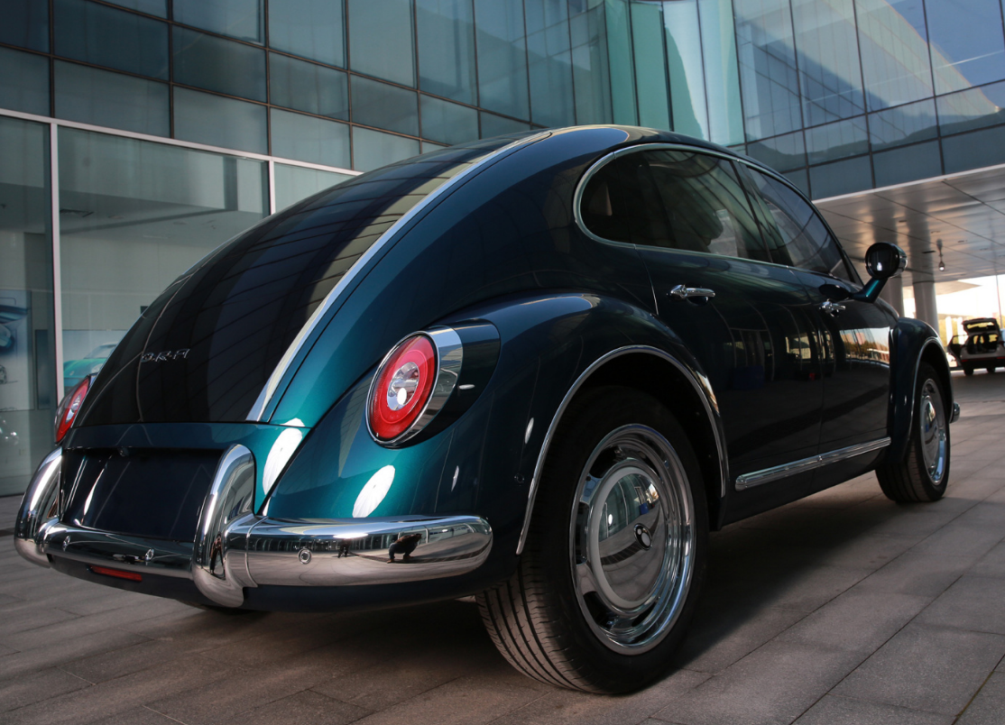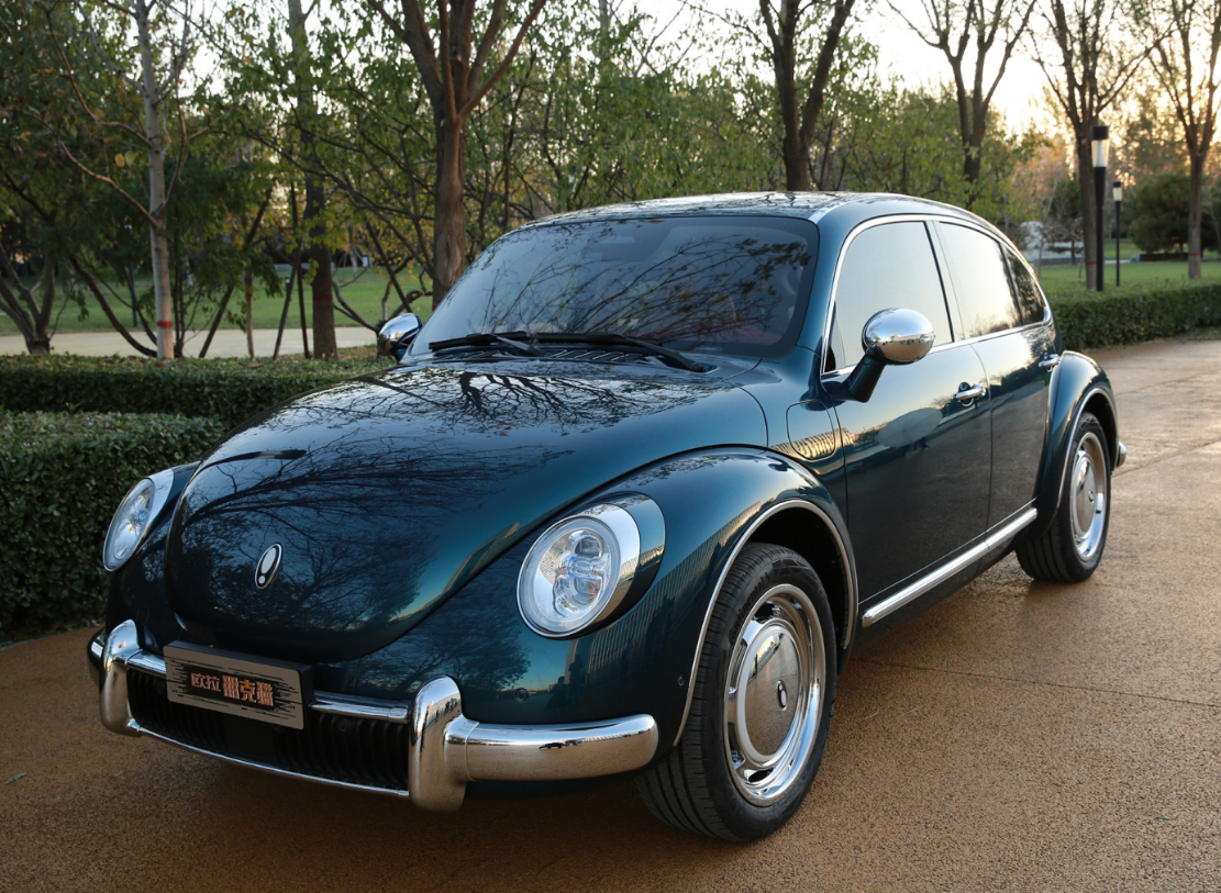 车头前脸就是辨识度很高的圆形复古大灯,镀铬保险杠搭配圆润的前引擎盖,如果换上大众车标,能够和甲壳虫初代产品难辨雌雄。尾部线条采用了大溜背设计,尾灯同样是圆形,再加上炫酷的大饼轮毂,整体看起来很有年代感,开上街的回头率必然很高。细节方面有炫酷的升降尾翼,这种设计有点像长安UNI-V。