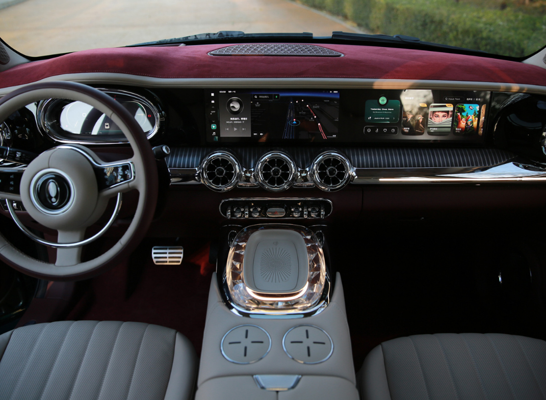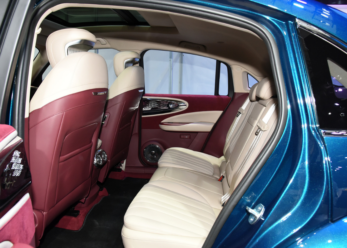 加上全液晶仪表就是三块大屏。圆形空调出风口像奔驰,中控扶手箱位置有水晶台面,每个细节都比大众的车更精致。真皮座椅是同样偏复古风格的大沙发,由于轴距超过2.9米,新能源平台的空间利用率也比较高,后排相当宽敞。