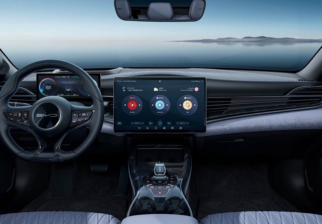 与外观相比,比亚迪海豹的内饰设计相对来说就比较平庸了,它采用了家族化的“海洋美学”设计风格,拥有两块儿悬浮式大屏和贯穿式空调出风口,整个中控台看上去都比较年轻化。中控屏依旧保留可选装功能,同时还采用了全新设计的电子档杆。在内饰设计方面,海豹没有什么新意,不过颜值还是相当不错的。