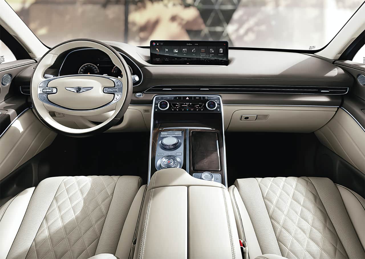 内饰运用大量的皮质、镀铬装饰以及木纹饰板点缀,营造出较强的豪华感。配备12.3英寸全液晶仪表以及14.5英寸悬浮式中控屏,搭载捷尼赛思信息娱乐系统,支持CarPlay、CarLife、百度语音识别、QQ音乐以及代客泊车模式等功能。此外,新车还将全车双层隔音玻璃、电动吸合门、裸眼3D仪表盘、全车座椅加热/通风以及主动降噪等功能列为全系标配。