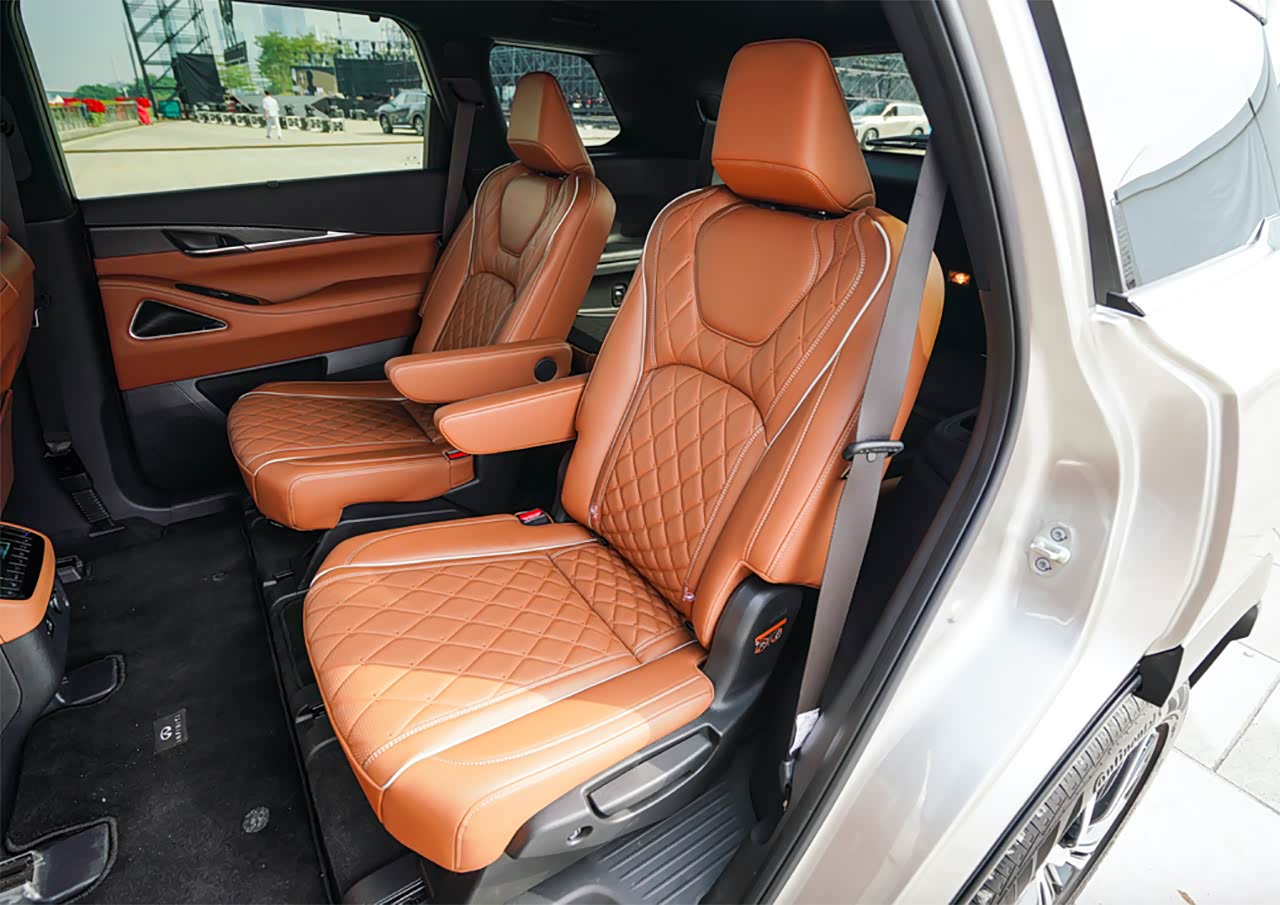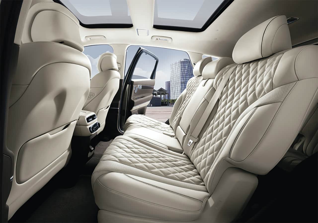 新车长宽高分别为5127/2005/1767mm,轴距2900mm,提供三排6座和7座两种布局,充分满足了不同家庭用户的需求。前排座椅电动调节、驾驶席座椅记忆为全系标配,高配车型还带有加热、通风和按摩功能。值得一提的是,三排座椅设计很有特点,采用了剧院式座椅布局,三排座椅呈阶梯状分布,每一排座椅均比前面一排要高一点,为后方乘客提供更好的视野。