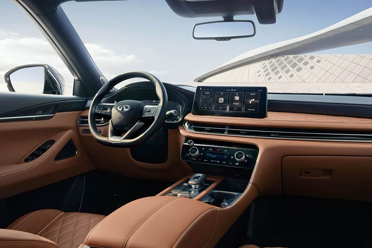 内饰对豪华感的营造很到位,中控台整体线条走向呈现出一种大气、精致的气息。配备12.3英寸全液晶仪表和12.3英寸悬浮式中控屏,顶配车型还拥有10.8英寸HUD抬头显示,搭配最新样式的电子挡把,科技感很强。中控屏搭载INFINITI InTouch 2.0智能互联系统,支持在线导航、语音控制、在线音乐、在线广播、车载KTV、行车记录仪、OTA升级等功能,同时导航系统还支持AR实景功能,另外通过“英菲智联”手机APP还能实现远程控制。