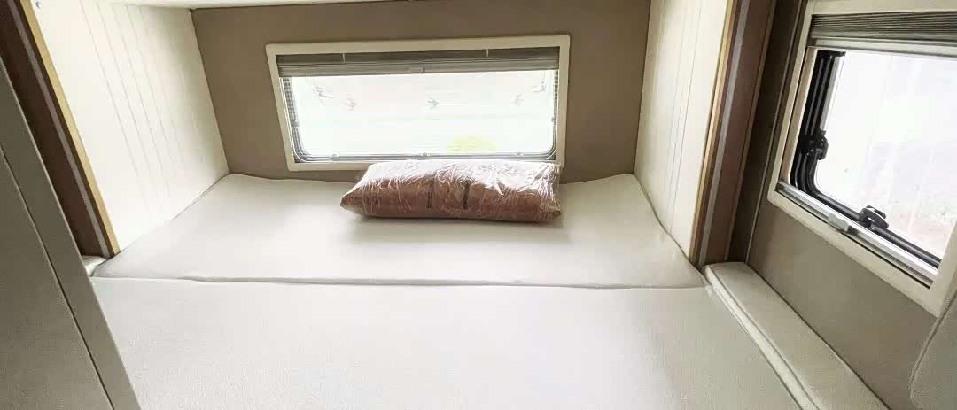 进入车内,新中式风格搭配环绕式内嵌灯带,简约清雅。进门左手边是卫生间+卧室,正对面的对卡座浅灰色沙发,尽显柔软舒适。卧室为横床设计,配备了乳胶床垫,尾置横床的实测尺寸为220x148cm,加上额头床,这款车睡5-6个人都没什么问题。