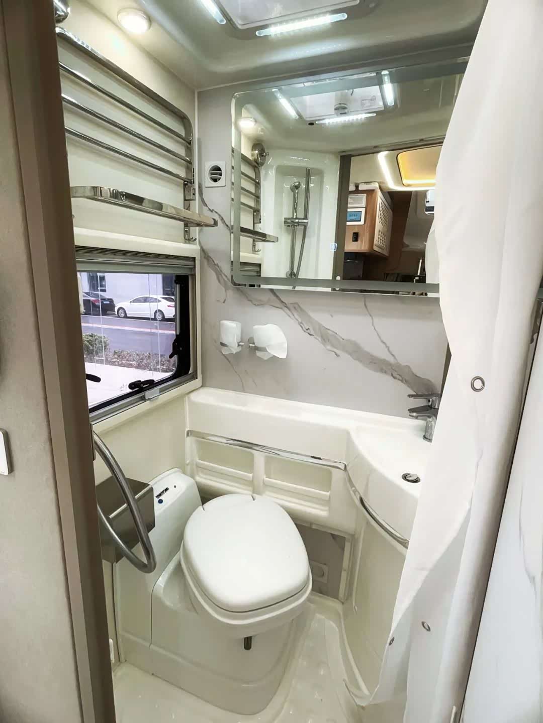 卫浴间内地台、固定洗手池等多处采用吸塑工艺,墙体为具有装饰作用的大理石饰板。内部宽敞明亮,该有的设备都一应俱全,整体配色非常的高级。