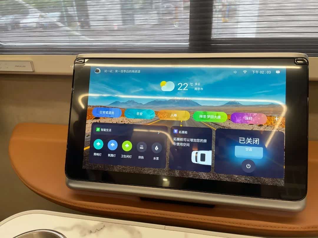 生活家V100自带的房车管家,是专为房车生活设计的全方位智能互联系统,大屏+语音+APP三位一体操控,“你好,小迈”呼喊小迈就可以实现智能语音交互。