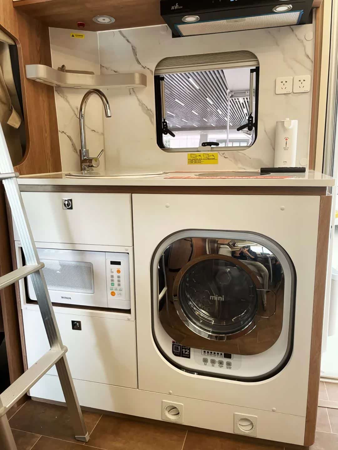 卡座对面就是厨房的区域,一体式的橱柜,内嵌了微波炉,洗衣机、即热饮水机,油烟机等设备;外置厨房配备了柴油炉、220V的插座、清水箱取水口等设备。驾驶舱后搭载了赛特福德142L双开门冰箱。