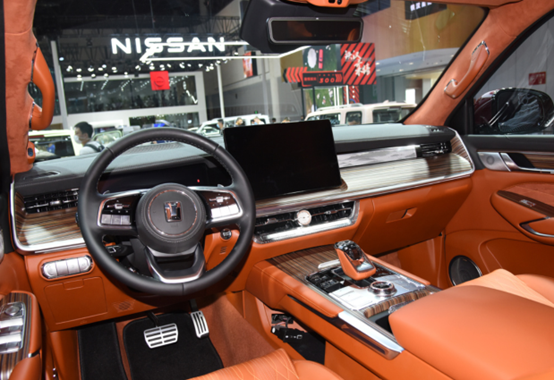 车内使用了撞色的设计,看起来很有个性。在用料反面,车内使用了大量皮质材料进行包裹,触感相当不错,符合其豪华的定位。除了12.3英寸的全液晶仪表盘外,中控屏幕的尺寸也达到了14.6英寸,支持一些常用的互联功能。仪表盘前方则是配备了HUD抬头显示系统,可以提供基础的时速,导航,辅助驾驶等信息。