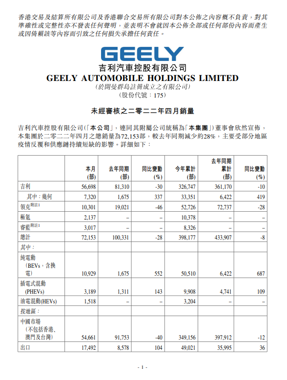 该公司昨日下午发布的信息显示,吉利汽车4月销量同比下降28%,至72,153台。