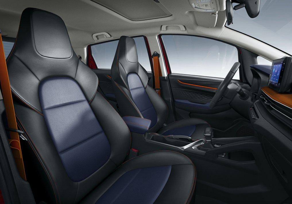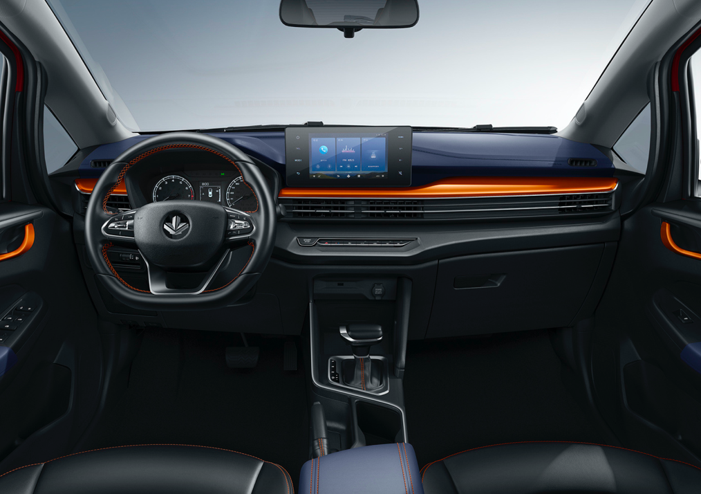 内饰采用全黑配色,但在中控台和车门把手处加入橙色装饰件,显得年轻有活力。采用时下流行的贯穿式空调出风口设计,下方保留了一排实体按键,方便行车操作。配备三幅式平底多功能方向盘,常规机械式仪表盘和8英寸悬浮式中控屏,支持蓝牙、手机互联等功能。