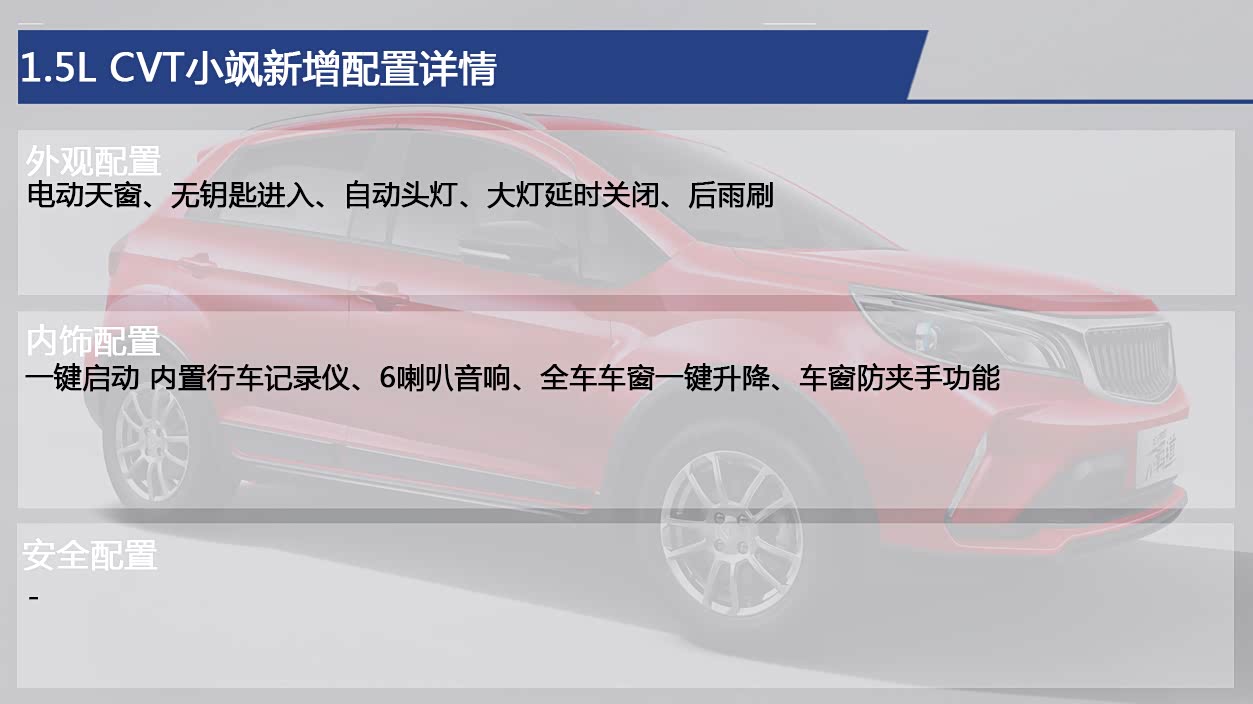 顶配车型是唯一一款自动挡车型,也是唯一提供电动天窗、无钥匙进入/启动、自动头灯、大灯延时关闭、内置行车记录仪、6喇叭音响、全车车窗一键升降、车窗防夹手功能等功能的车型,舒适性和便利性都得到提升,是重点推荐的车型。
