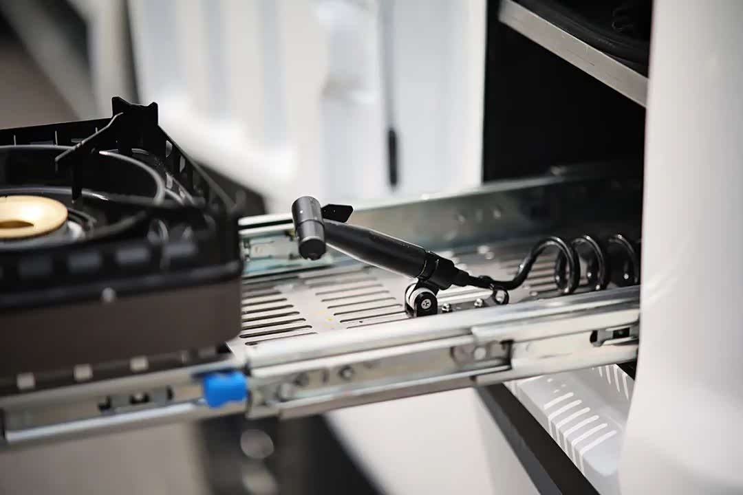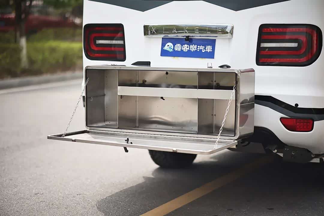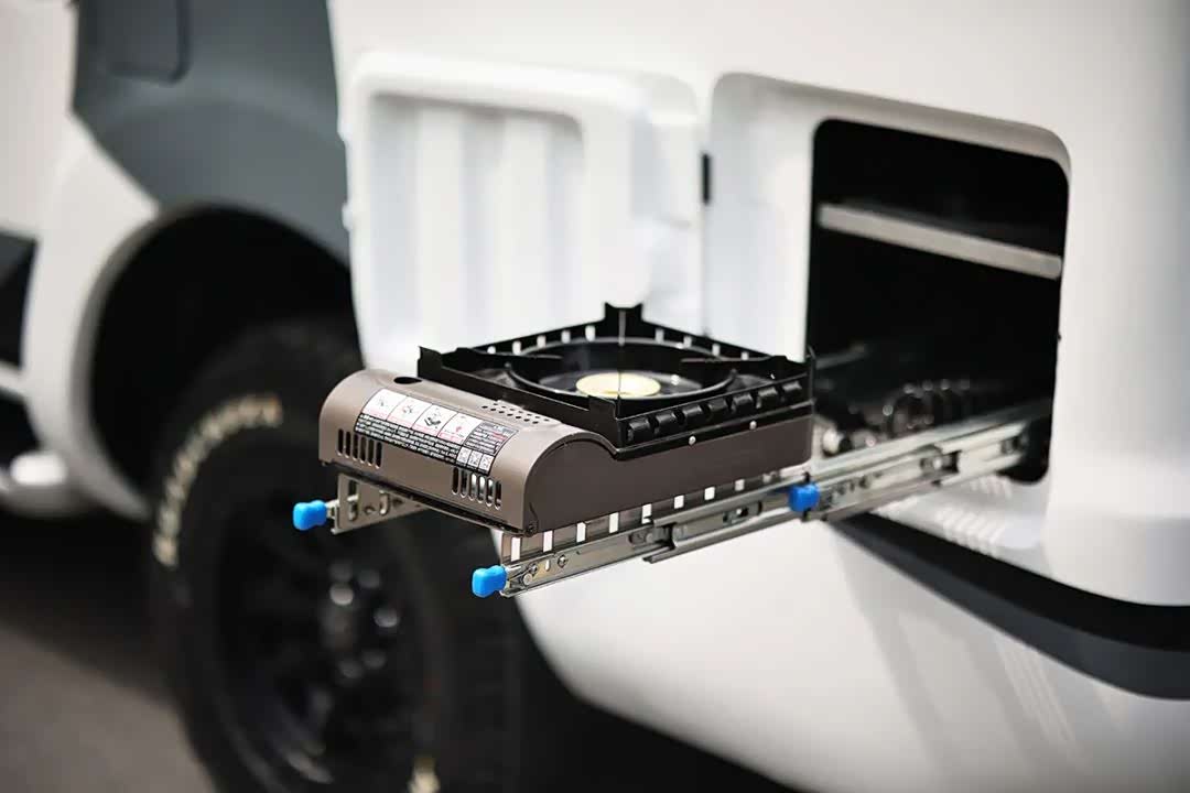 抽拉式车外灶台,满足用户车外做饭功能,既不受空间限制,同时也能杜绝油烟污染车内。