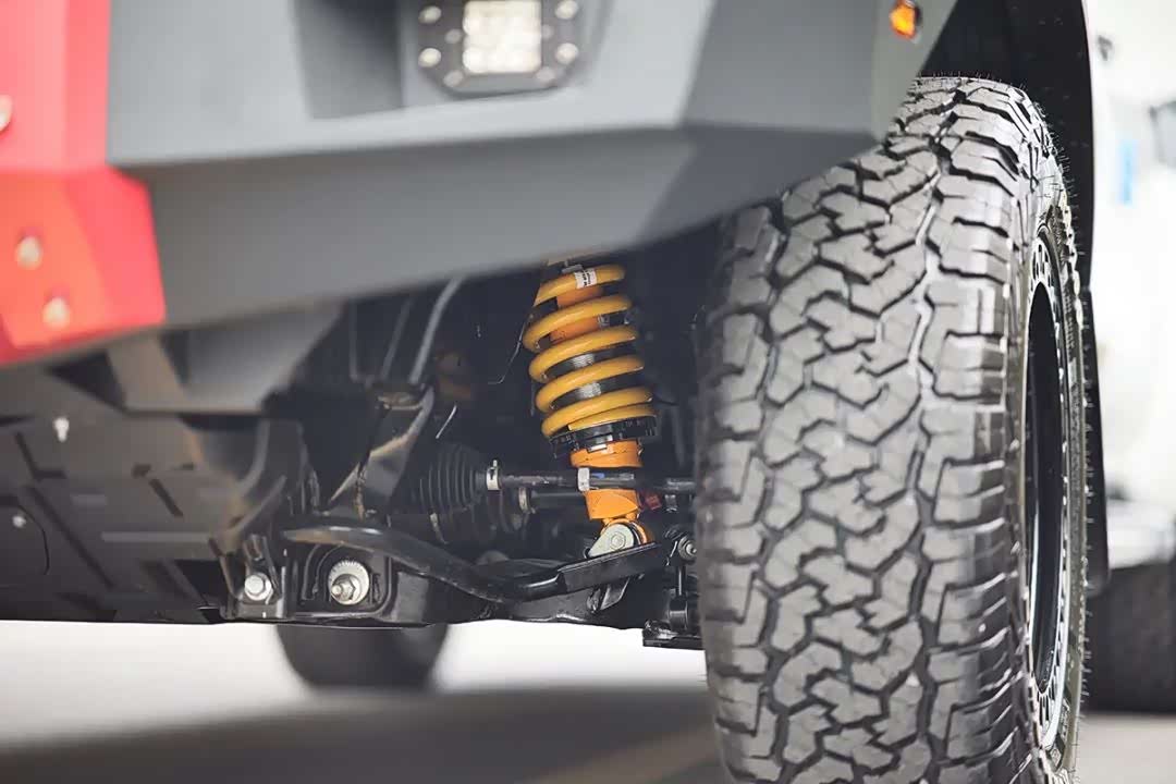 底盘悬挂部分,前轮选装了9段可调的加强油压减震,后轮选装可调节高度的气囊减震。