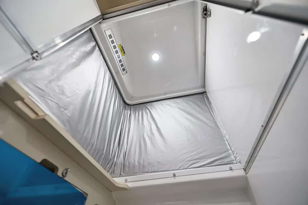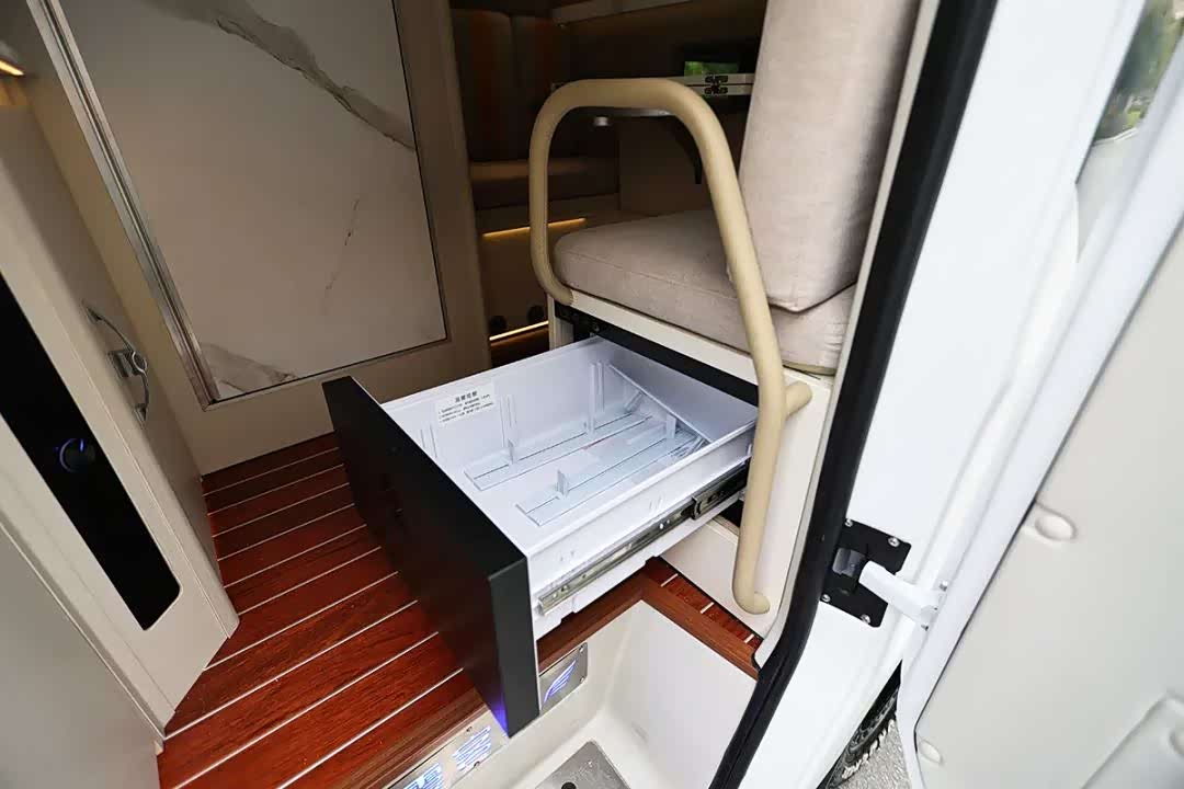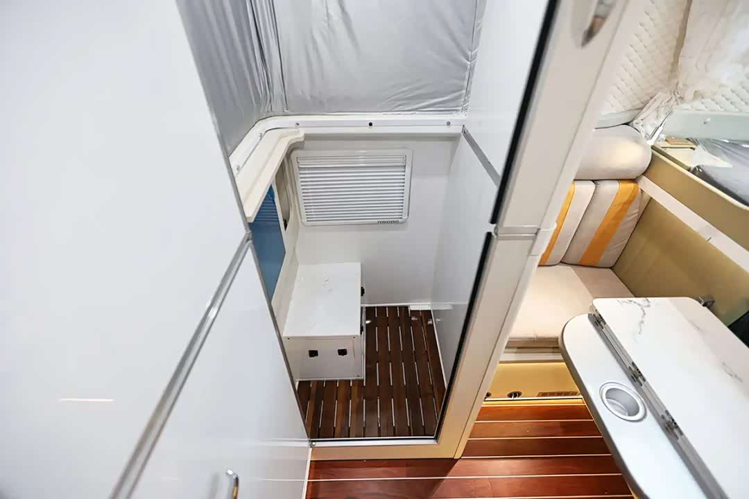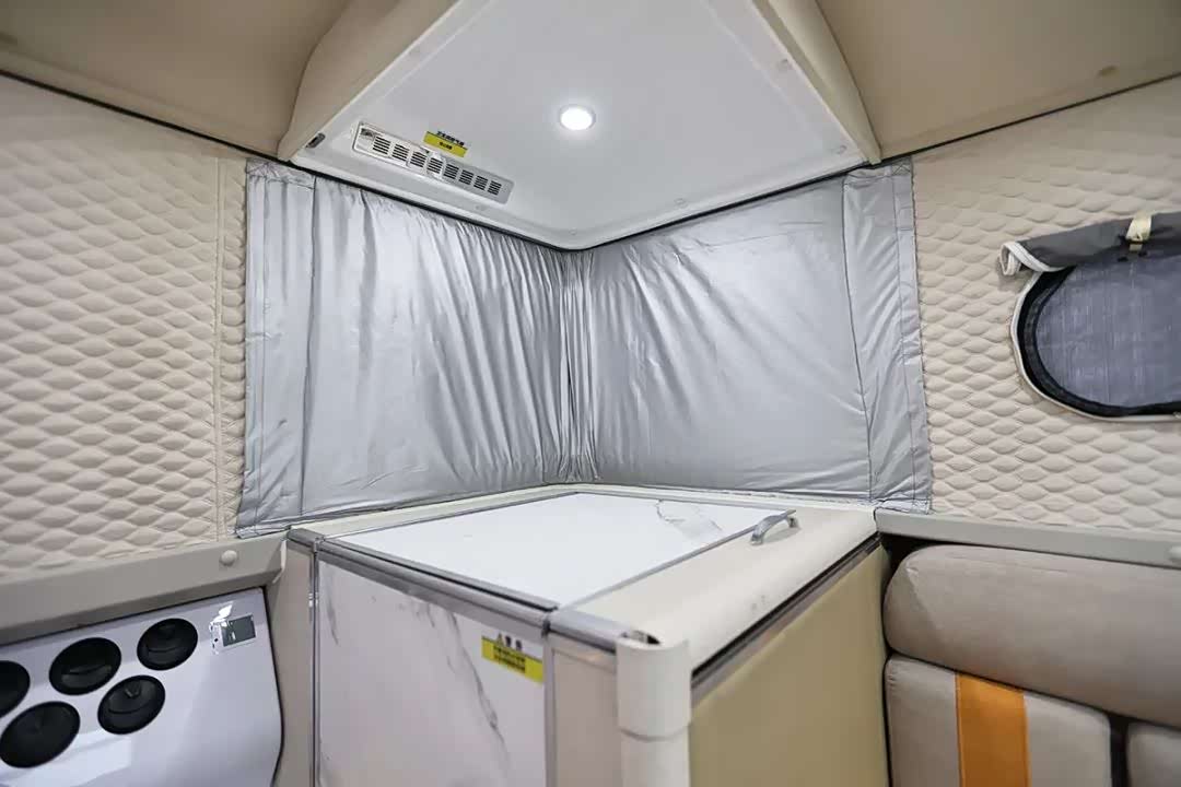 这款升顶房车的特别之处在于,它通过折叠墙体的设计,实现了类似于传统C型房车的独立卫生间,内部面积0.72平米,内高1.92米。