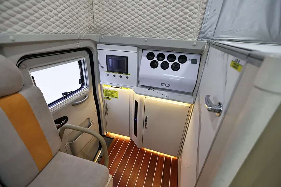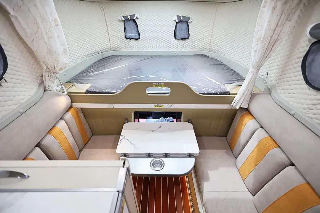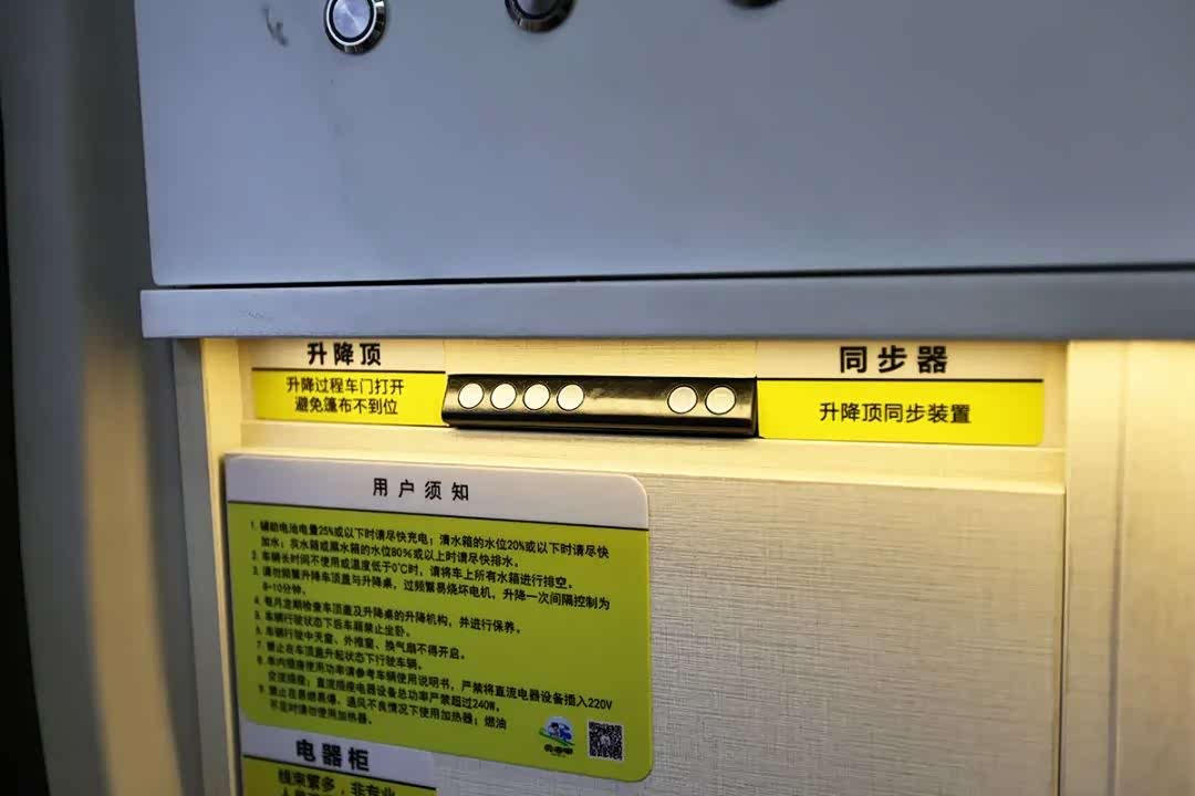 虽然2.16米的车高改善了房车被限高杆拦截的痛点,但同时也会使车内垂直空间变得局促,霞客乐SUC给出的解决方案是电动升顶机构,车顶完全升起后车高为2.85米。
