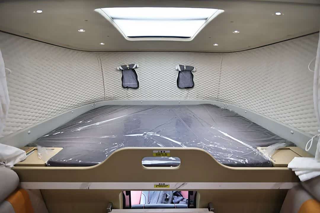 虽然这款霞客乐SUC的体型比主流依维柯房车小不少,但是驾驶室上方这张床位的空间让我较为意外,床位尺寸1.91×1.25米,垂直高度达到了80厘米。内侧设置2个换气窗口,带有防蚊纱帘。