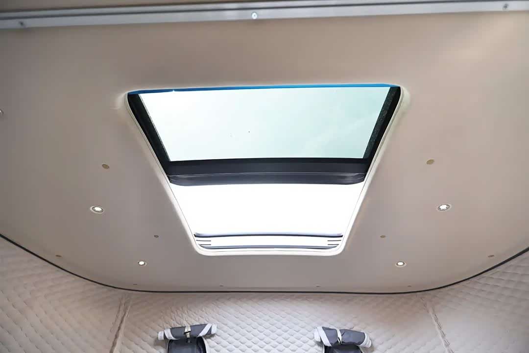 不同于常见的房车天窗,这款房车采用电动开启换气/打开遮阳帘的乘用车天窗。