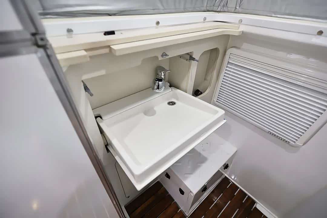 为节省空间,洗手池为折叠式设计,水龙头抽出即为淋浴花洒。