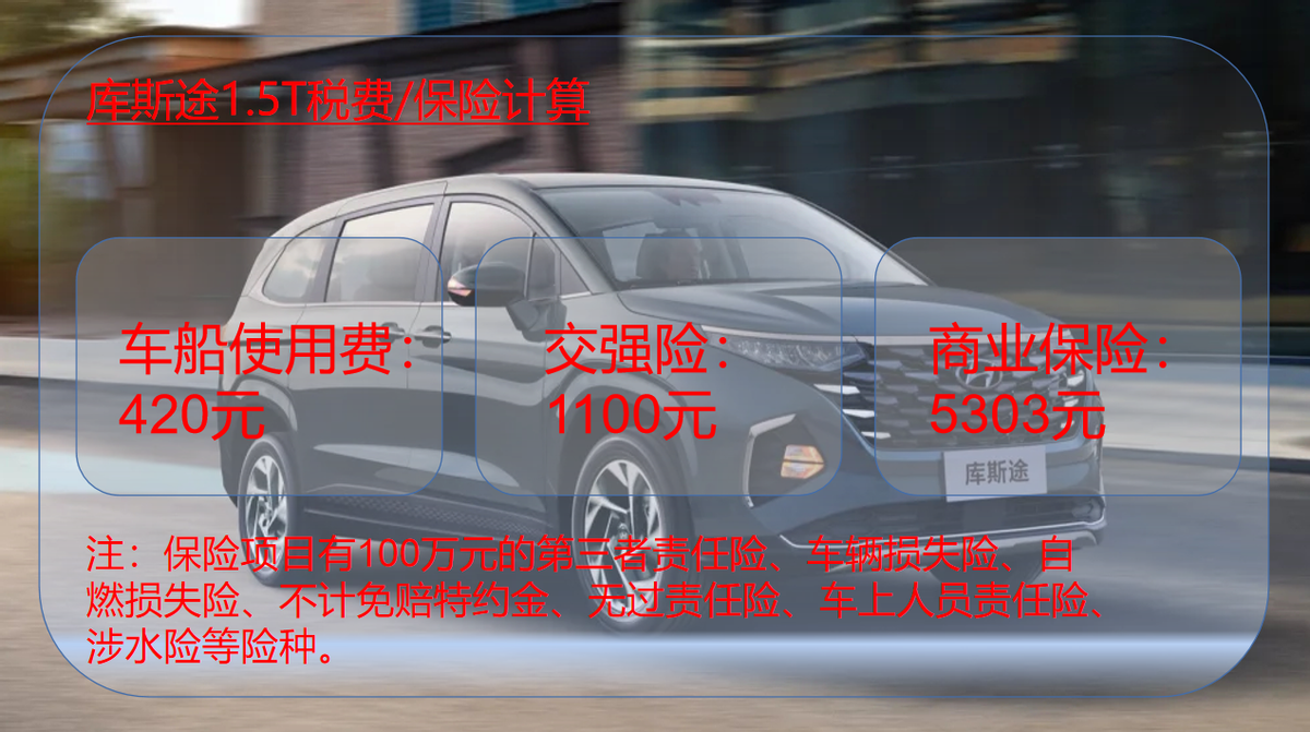 税费/保险部分,我们就以车系中价格最低的1.5T领先版GLS来计算,每年需要缴纳费用的项目有车船使用费、交强险、商业保险三种。其中,车船使用费部分,该车每年要缴纳420元;交强险部分,该车每年要缴纳1100元;商业保险部分,我们选择了100万元的第三者责任险、车辆损失险、自燃损失险、不计免赔特约金、无过责任险、车上人员责任险、涉水险等险种,总花费为5303元。当然,保险价格要根据用户当地实际价格为准,该结果仅供参考。