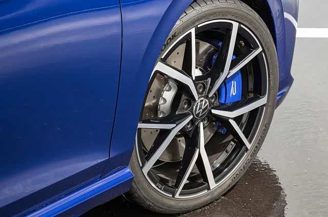前轮的刹车盘尺寸从上一代的340 x 30 毫米变为 357 x 34 毫米,而标准高尔夫的刹车只有290毫米。新的制动器由销盘和铝制制动罐制成,每侧减轻了 600 克的重量。机电制动伺服系统重新调校,高速紧急刹车和低速行驶刹车带来的回馈不同,可以更精准地控制刹车。