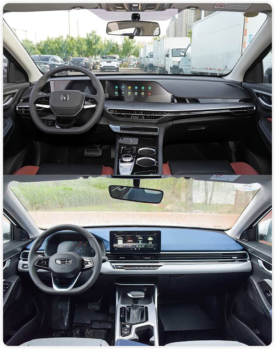 两车的内饰风格依旧延续着各自外观的设计理念。长安逸动PLUS采用了时下流行的双联屏设计,中控台略微偏向于驾驶员,整体氛围感和科技感更强。第4代吉利帝豪的内饰胜在做工以及用料更出色,皮质覆盖区域的手感细腻,即便与更高价位的合资紧凑型车相比,也并不逊色。