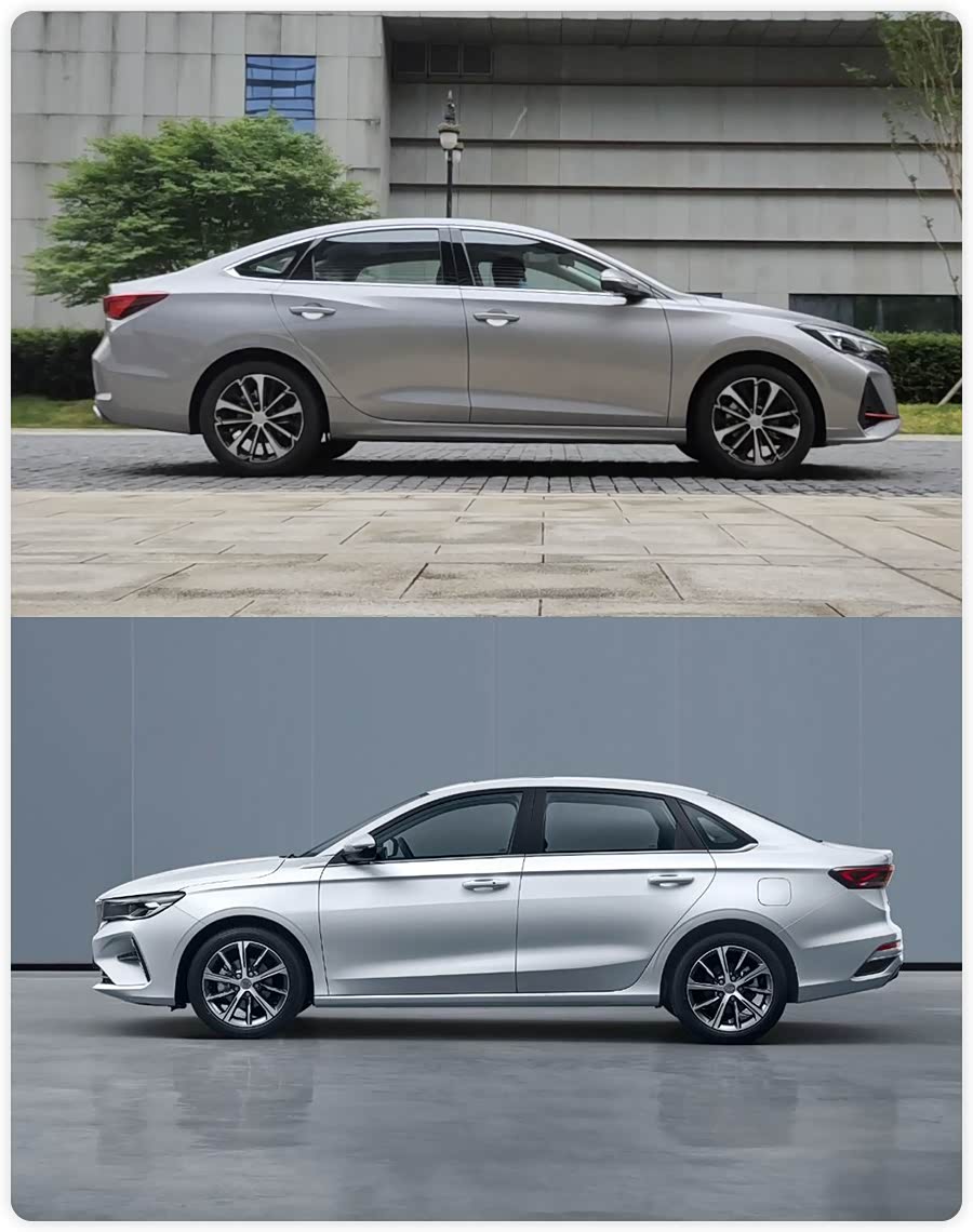 两车在侧面的车身线条可以说是前脸设计风格的延续。长安逸动PLUS的车身线条后高前低,有种向前俯冲的架势,更显年轻运动;第4代吉利帝豪的车身线条平直简约,相比逸动PLUS更平缓、沉稳。