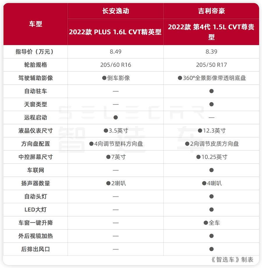在配置方面,我们以指导价相近的车型为例,这里我们例举2022款长安逸动PLUS的1.6L精英版车型和2022款吉利第4代帝豪的1.5L尊贵版车型作为对比车型,两车在指导价上仅相差1000元。同时这两款配置车型也是目前各自车系中,热度较高的配置车型,下面我们就来具体看看两车的配置差异。