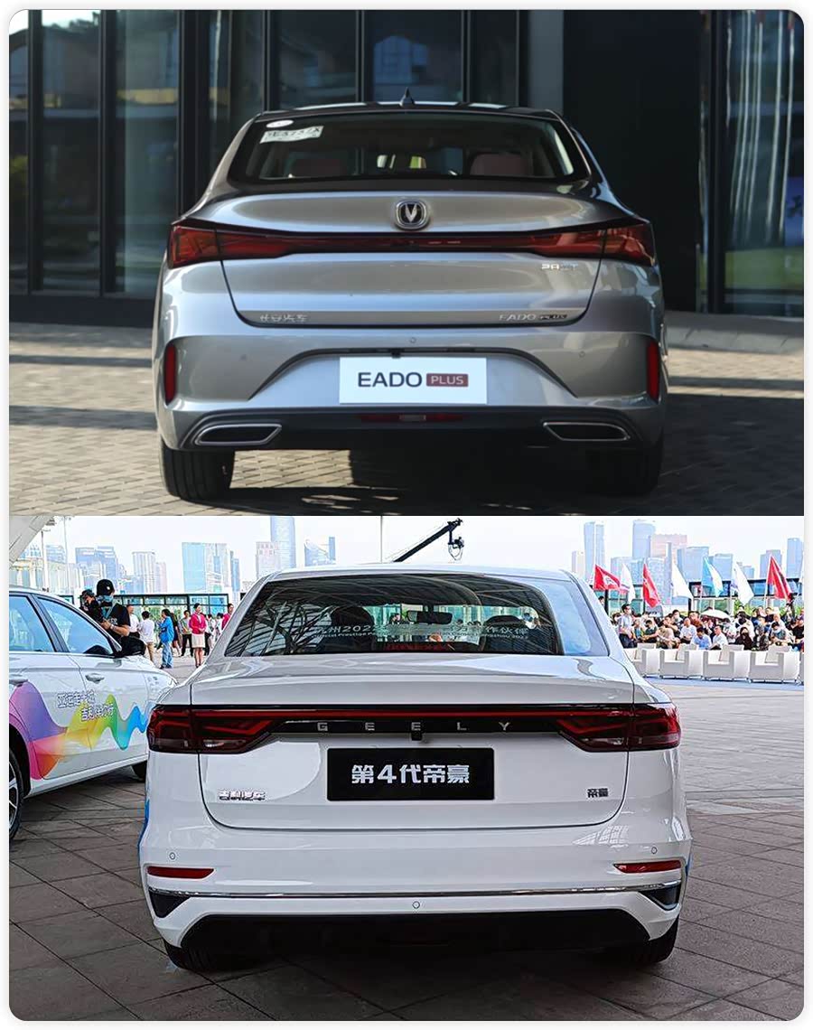 两车车尾都不约而同的选择了贯穿式尾灯的设计。第4代吉利帝豪的保险杠厚重感更强,整体视觉效果比较靠上,而长安逸动PLUS选择将牌照框放置在下方位置,并且采用了双边单出的排气样式,整体视觉重心更低,也营造出更强的运动感。