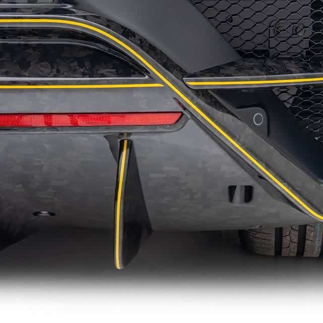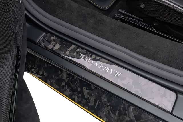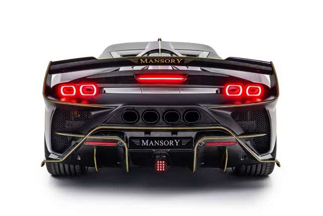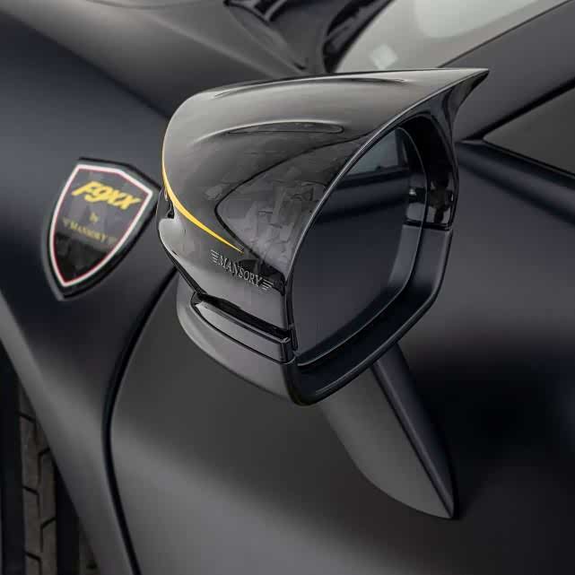 MANSORY迈莎锐F9XX,无论是车头日行灯罩、前唇、前保险杠等;车身后视镜盖、侧裙等;车尾排气筒、后保险杠、扩大的扰流板等,均采用了昂贵的航空级锻造碳纤维材料制作而成。