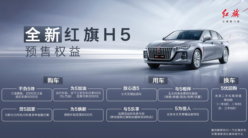 5月31日,汽车商评从红旗汽车官方处了解到,旗下全新轿车 红旗H5(参数|询价)量产仪式在中国一汽红旗繁荣工厂正式举行,新车预售价格为17万起。事实上,新车除了预售价格给人惊喜之外,此次红旗还为订车用户带来了专属豪礼,例如在购车方面,订车用户支付2000元订金可以抵扣5000元的购车款;而在订车后等车期间,每天还可享50元的出行补贴。