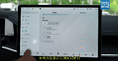 中控屏车机菜单的架构比较直观,各项功能都在左侧纵向排列,点击后即可展开相应界面,给人条理清晰的感觉,初次使用也容易上手。