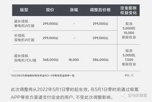 在价格方面,极氪001刚刚发布了5月1日生效的“涨价方案”,极氪官方表示,这是受上游原材料价格大幅上涨、全球供应链紧张等因素叠加带来的影响,成本和供应链压力使得企业只能选择涨价。