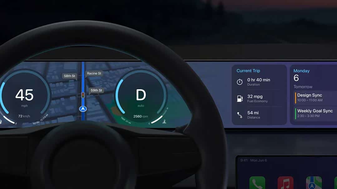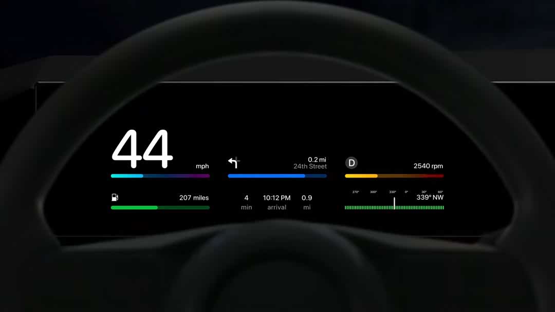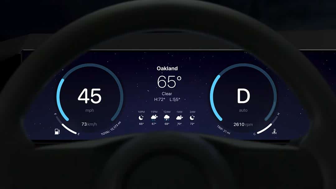 发布会上,我看着苹果展示的那张涵盖驾驶舱的设计图,仪表盘呈现车辆信息,中控屏呈现地图、娱乐和天气信息。一时有些恍惚,很难说这是汽车里配备了苹果的CarPlay软件,还是苹果的软件世界中出现了一款车。