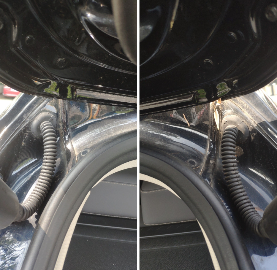随后检测引擎盖漆面数值同样在200微米左右,外观没有发现飞漆毛边等现象,固定螺丝也没有拆卸拧动痕迹。