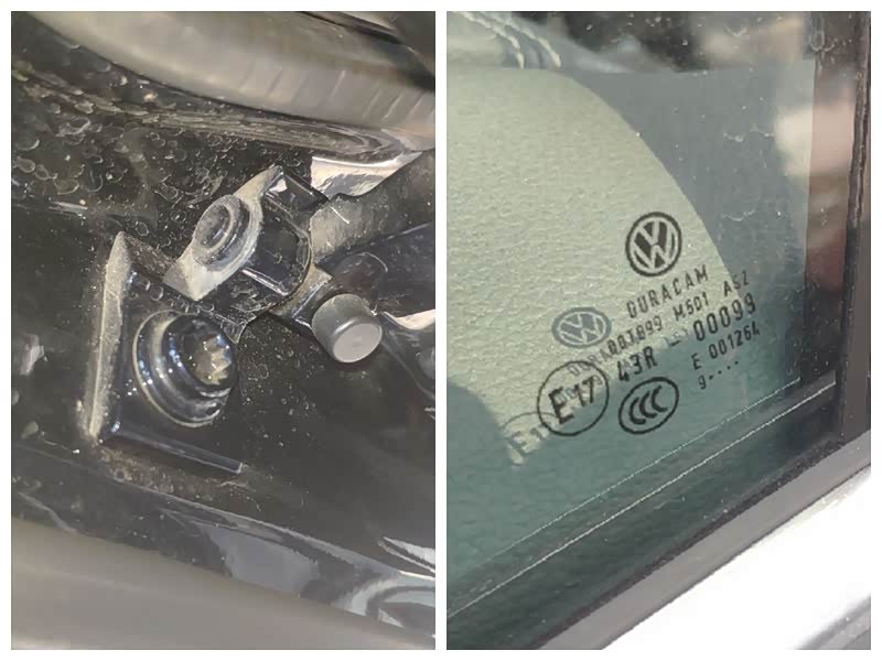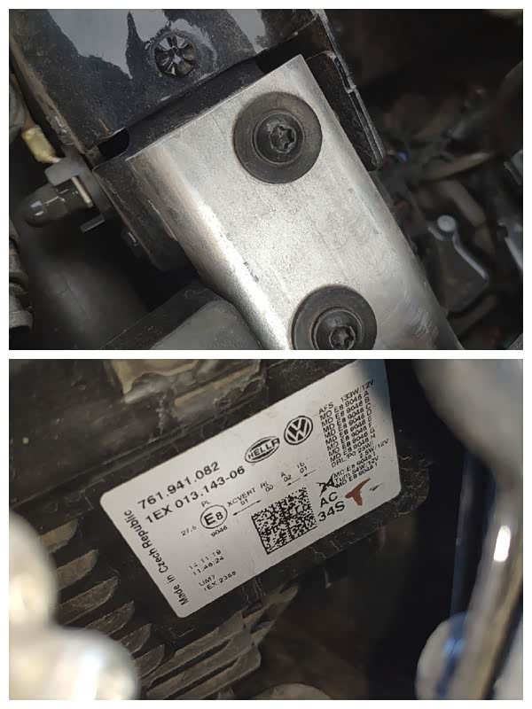 可以看到水箱框架螺丝没有拧动拆卸的痕迹,周围的附件同样也没有拆卸的痕迹;左右两侧大灯固定螺丝没有拆卸拧动痕迹,与前保险杠叶子板之间的缝隙都很均匀,生产日期也吻合车辆的出厂日期。