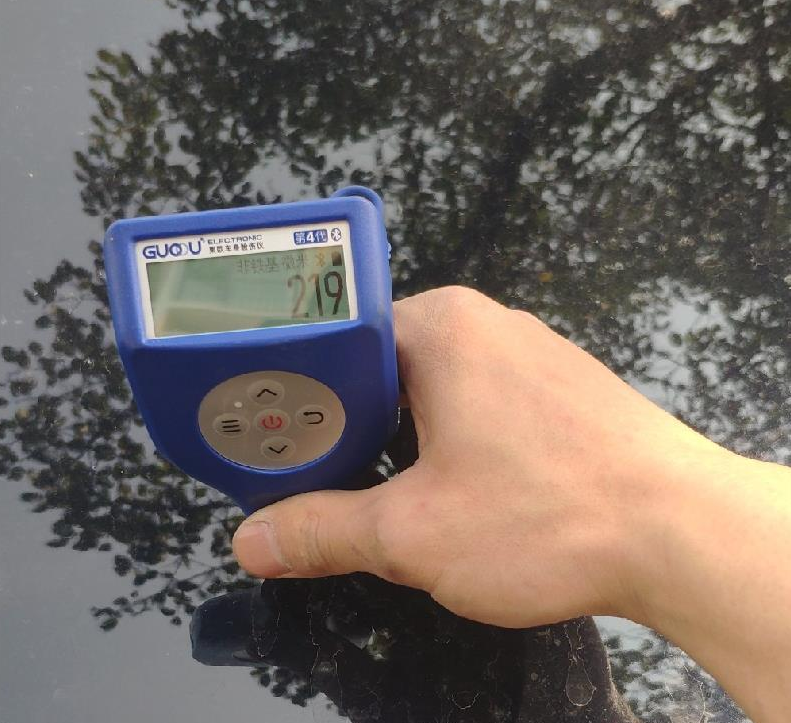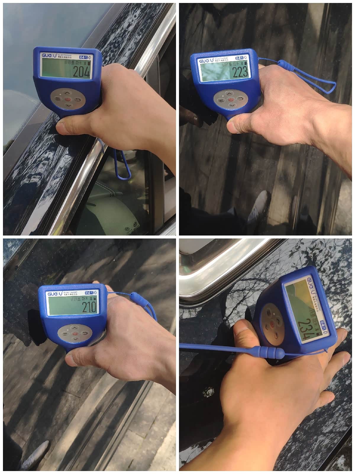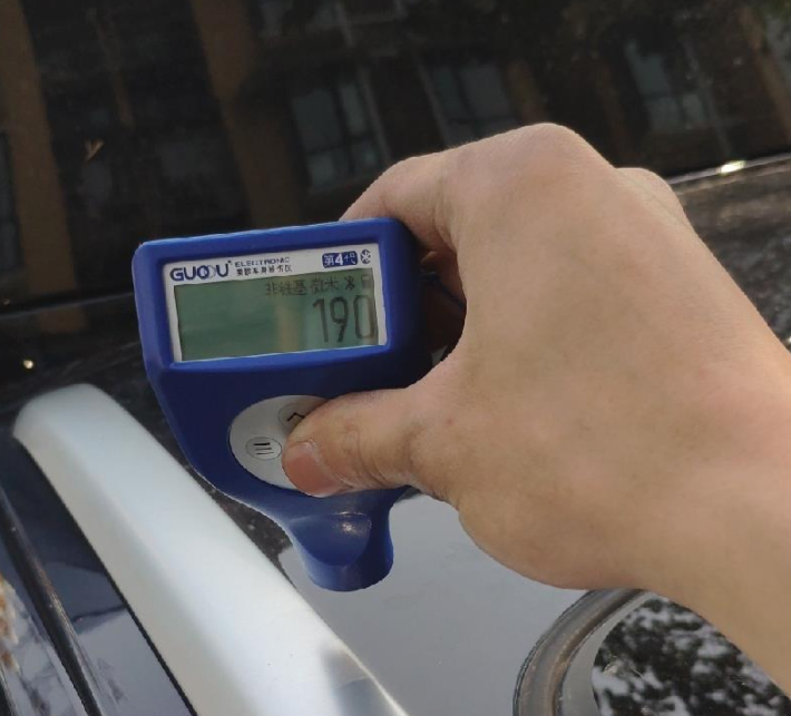 随后测量车顶漆面数值,对比其它金属面,经过检测发现,车顶漆面数值在200微米左右,高于正常德汽车漆面数值,难道车顶有过二次喷漆吗?随后我反复观察车顶的漆面情况,并没有二次喷漆现象,最终确定车顶为正常数值。看来进口大众的漆面要厚一些呀。