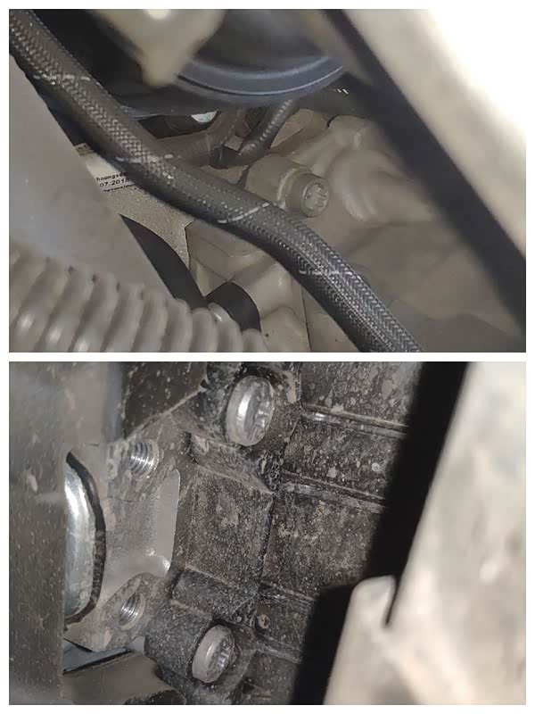 可以看到发动机侧的机脚固定螺丝没有拆卸拧动的痕迹,整个正时一侧包括皮带轮,这些附件也都没有拆卸过。