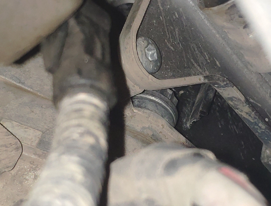 从底盘再检查一下发动机和变速箱,可以看到发动机和变速箱连接处螺丝没有拆卸拧动的痕迹,也没有渗油漏油的痕迹。