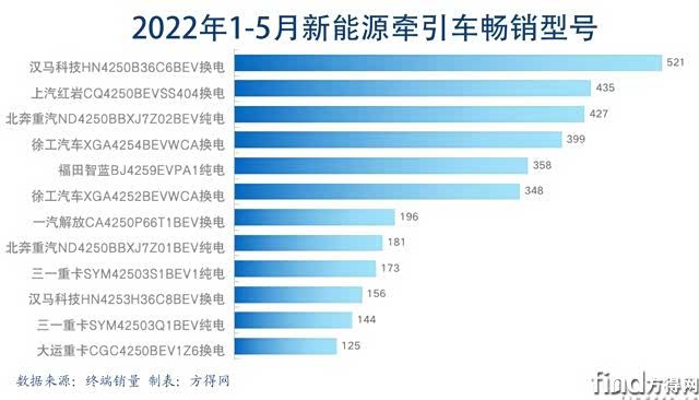 2022年1-5月,哪个品牌哪款新能源牵引车更受欢迎?