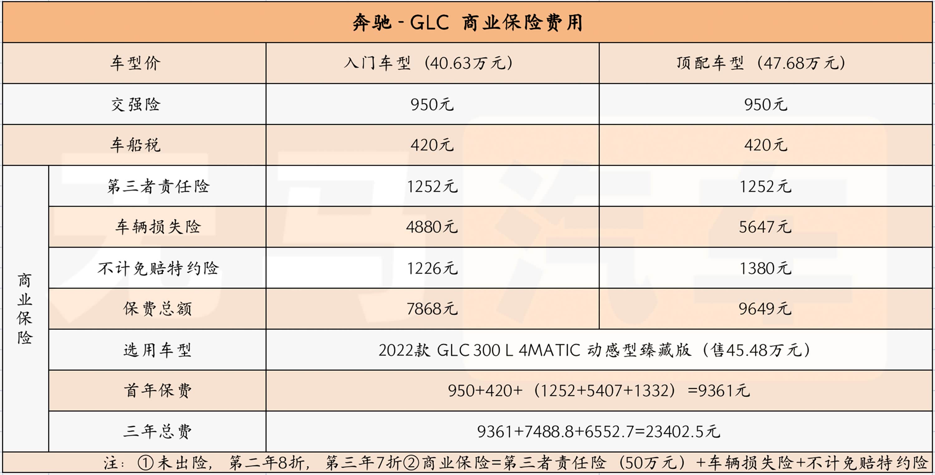 另外,考虑到2022款 GLC 300 L 4MATIC 动感型臻藏版(售45.48万元)为现款奔驰GLC中关注度较高的车型,商业保险这一块,我们就以它为参考车型计算相关费用,经计算,它三年需要在保险方面产生的总费用为23402.5元,平均一年需分摊约7801元。