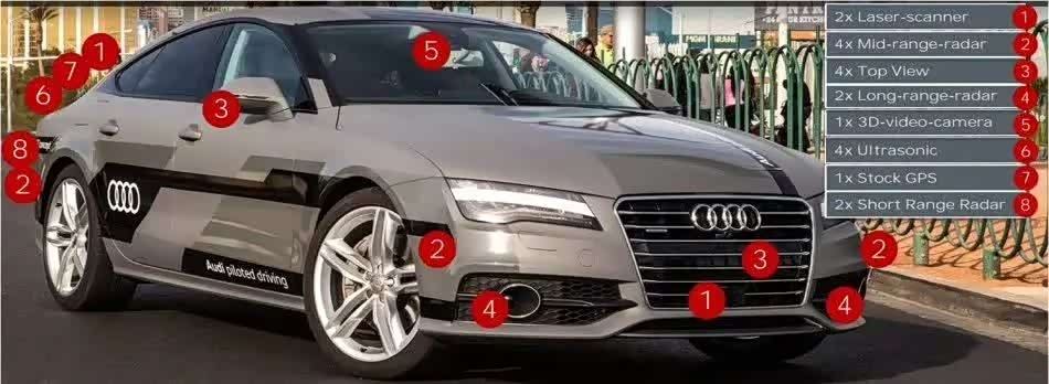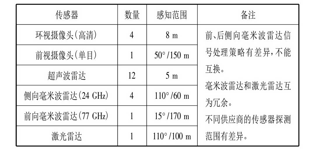 12 个超声波传感器,位于前后及侧方,4 个广角 360 度摄像头,位于前后和两侧后视镜,1 个前向摄像头,位于内后视镜后方,4 个中距离雷达,位于车辆的四角,1 个长距离雷达,位于前方,1 个红外夜视摄像头,位于前方,1 个激光扫描仪 Laser Scanner,位于前方。