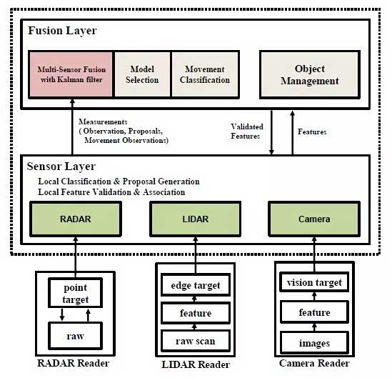 算法设计上用到Sensor Fusion,下图是CMU的多传感器融合的障碍物检测/跟踪框架[2]: