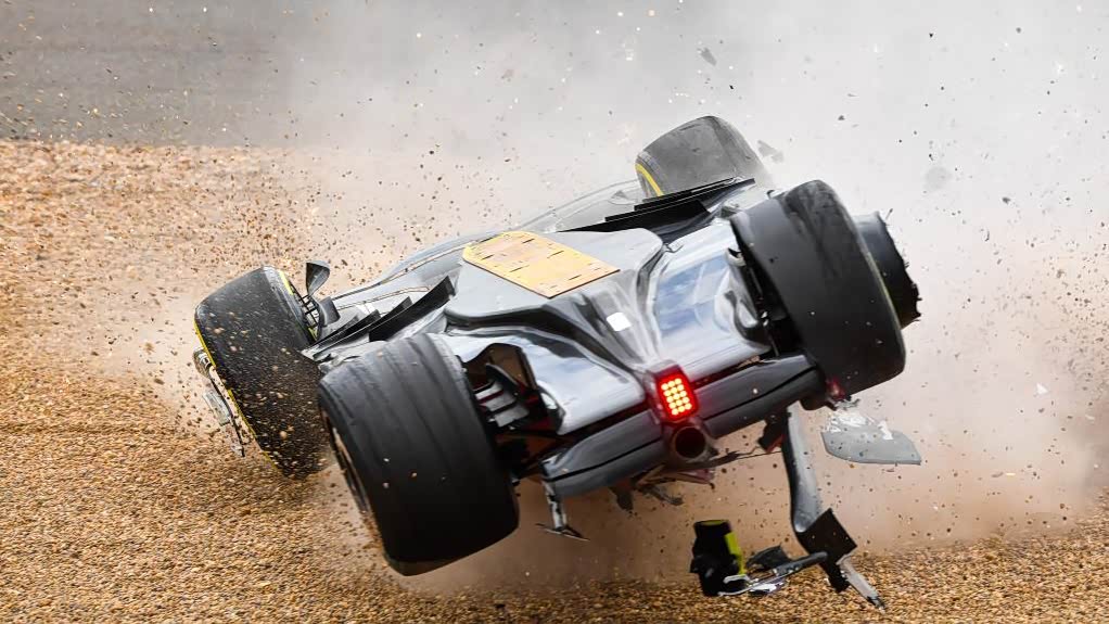 “惊险!中国首位F1车手周冠宇遭遇严重事故,赛车被撞飞、翻滚、倒立滑行!”