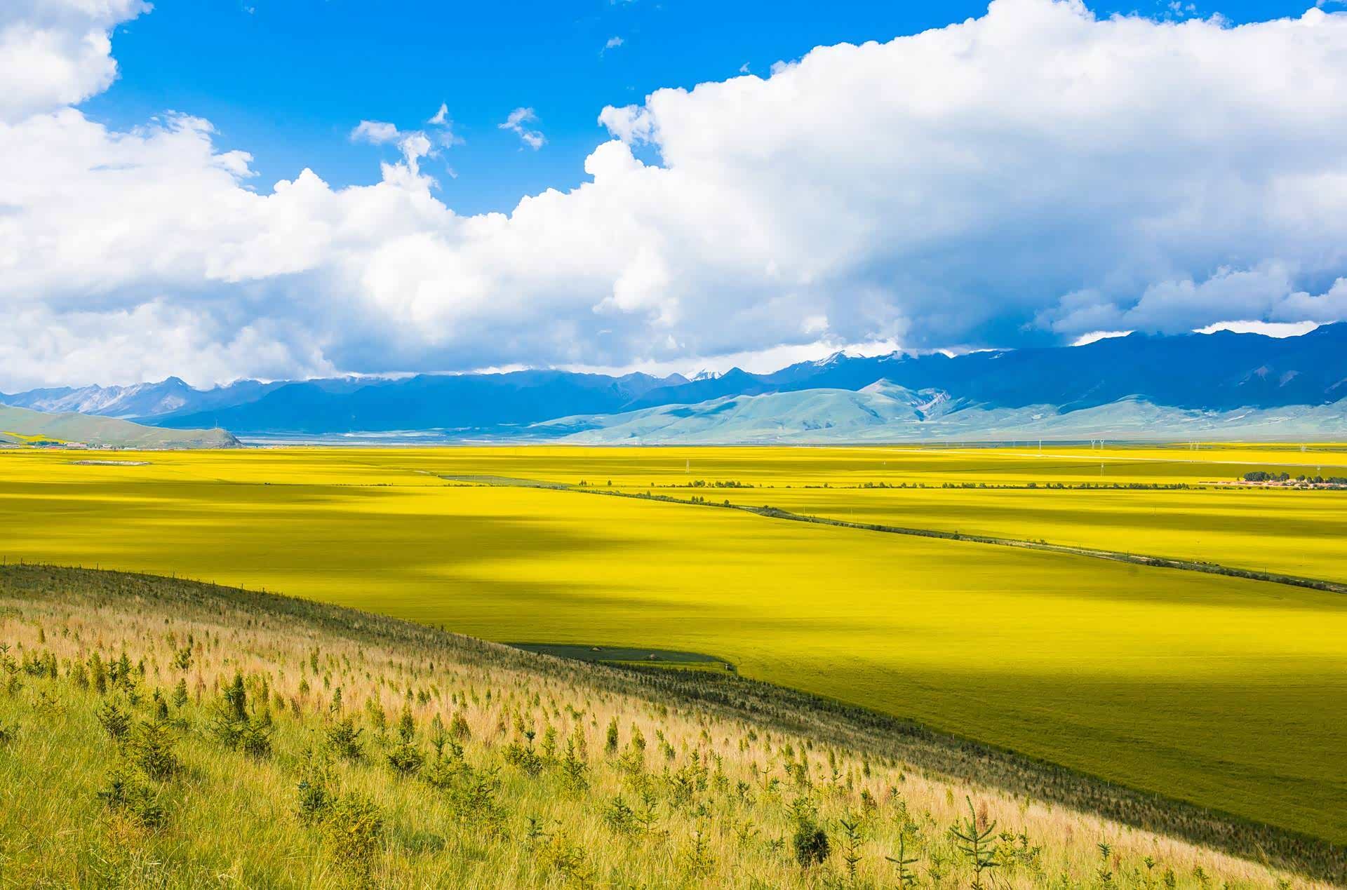 门源油菜花集中在青石嘴,是中国最美油菜花之一。花期在7月中旬,上万亩油菜花在祁连雪山映衬下,美得惊艳。