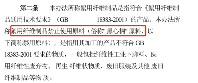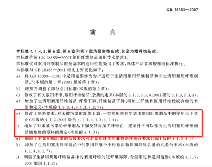 但这里需要注意的是,以上要求是2001年制定的,但在2007年修订的GB18383-2007《絮用纤维制品通用技术要求》中,调低了原料要求。由原来的“禁止使用”修改为“在一定条件下可以使用”。也就是说,之前明确规定禁止使用的黑心棉在2007年之后变成,可以使用的再生棉。