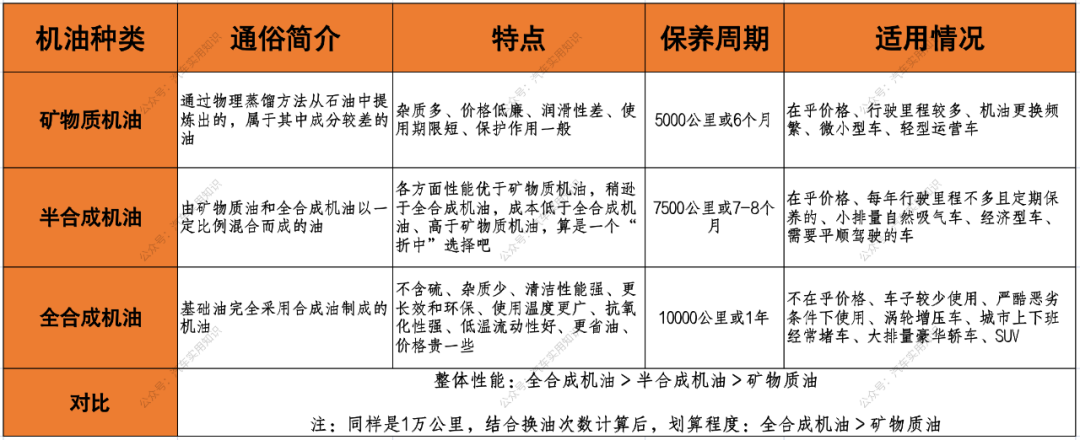 矿物质机油、半合成机油、全合成机油的区别,大家可以参照下表: