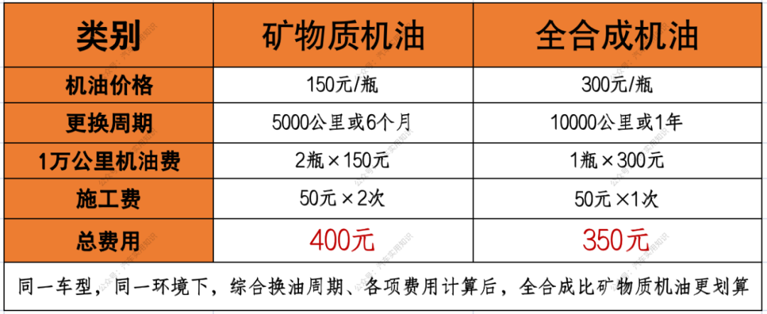 从上表中我们可以看出,因为全合成机油保养里程比矿物质油长很多,所以同样是一万公里,在结合换油次数计算后,其实全合成机油比矿物质机油更划算,而且还省时省力效果好。