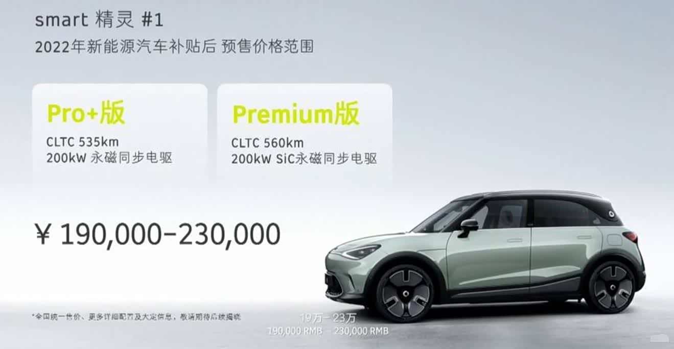 2022年4月25日发布了smart精灵#1,并公布了预售19-23万元的售价。需要注意的是(1),官方发布的这两款smart精灵#1,均为后置动力总成后轮驱动的车型。而四驱版的售价和更多的技术状态没有公布。