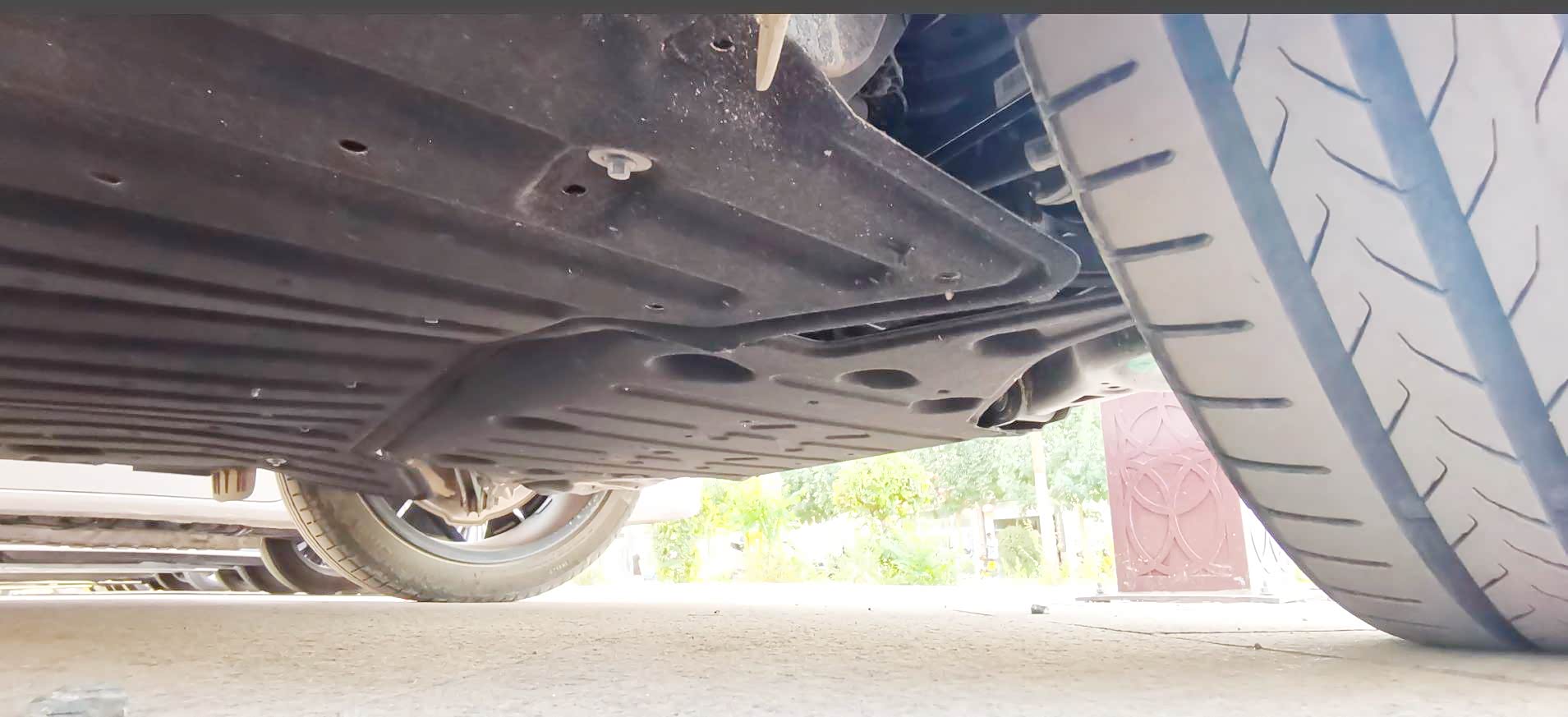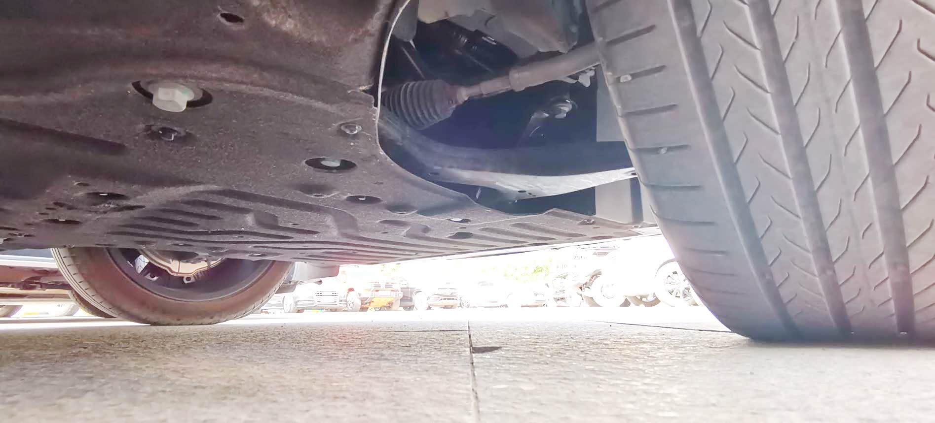 可见的是钢材质下A型摆臂以及齿条式转向机外拉杆,另外下护板完整的包裹住前副车架。