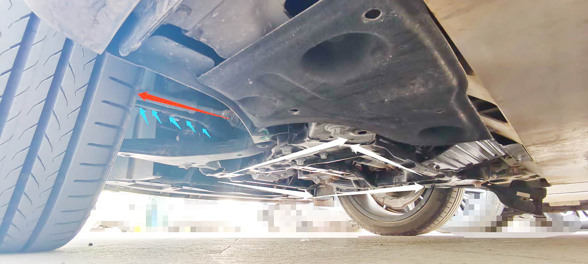 可见的是钢材质下A型摆臂、齿条式转向节外拉杆(红色箭头所指)、前置电驱动系统至轮端的传动半轴(蓝色箭头所指)以及拆卸掉下护板后裸露出钢材质的全框型前副车架(白色箭头所指)。