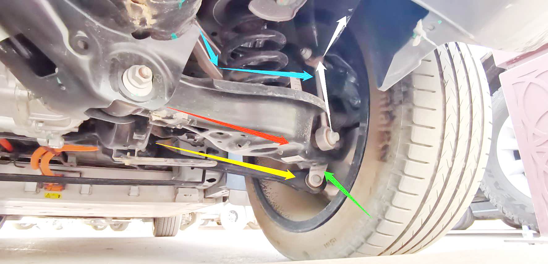 红色箭头:固定弹簧和减震器芯体的下A型摆臂